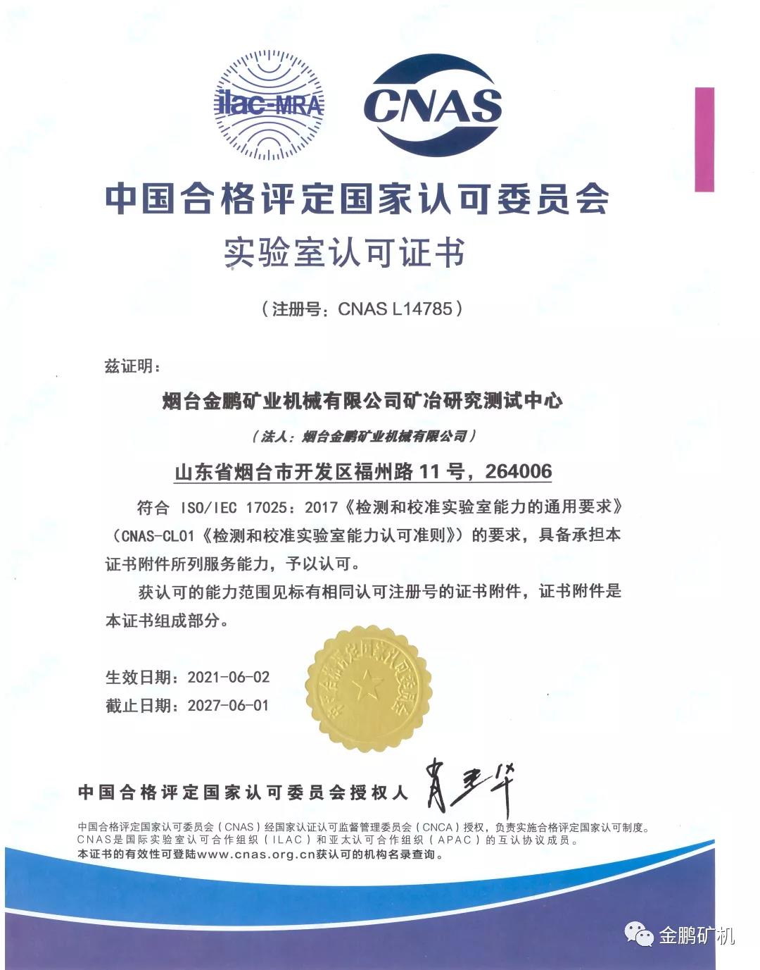 碩果源于奮斗 創(chuàng)新彰顯實(shí)力——熱烈祝賀金鵬礦機(jī)礦冶研究測(cè)試中心通過CNAS認(rèn)證