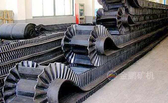 波狀擋邊輸送帶中以大傾角波狀擋邊輸送帶最有名,大傾角波狀擋邊輸送帶又叫裙邊隔板輸送帶,是由基帶、擋邊、橫隔板3部分組成。擋邊起防止物料測滑撒落的作用。為便于繞過滾筒,檔邊設計成波紋狀;橫隔板的作用是承托物料,為了實現(xiàn)大傾角輸送,采用T型TC型。檔邊和橫隔板是用二次硫化的方法與基帶連接的,具有很高的連接強度。