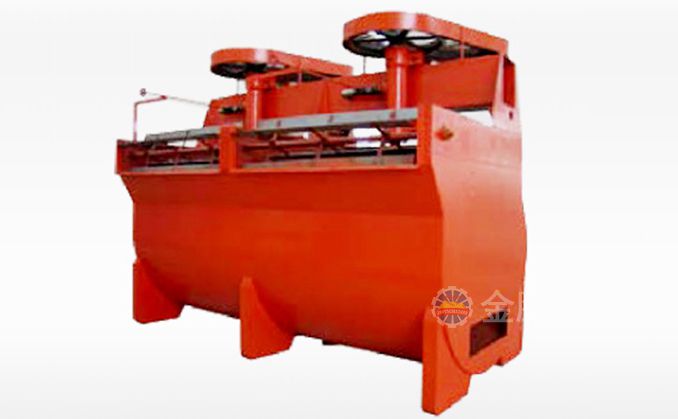 該浮選機(jī)工作時,隨著葉輪的旋轉(zhuǎn),槽內(nèi)礦漿從四周經(jīng)槽底由葉輪下端吸到葉輪葉片之間由鼓風(fēng)機(jī)給入的低壓空氣經(jīng)空心軸和葉輪腔的空氣分配器,也進(jìn)入其中。礦漿與空氣在葉片之間充分混合后,從葉輪上半部周邊向斜上方推出,由定子升穩(wěn)流和定向后進(jìn)入整個槽子中。氣泡上升到泡沫穩(wěn)定區(qū),礦化富集后,自溢流堰溢出。另一部分礦漿向葉輪下部流去,再經(jīng)攪拌,重新混合形成礦化氣泡。剩余的礦漿流向下一槽直至最終成尾礦。