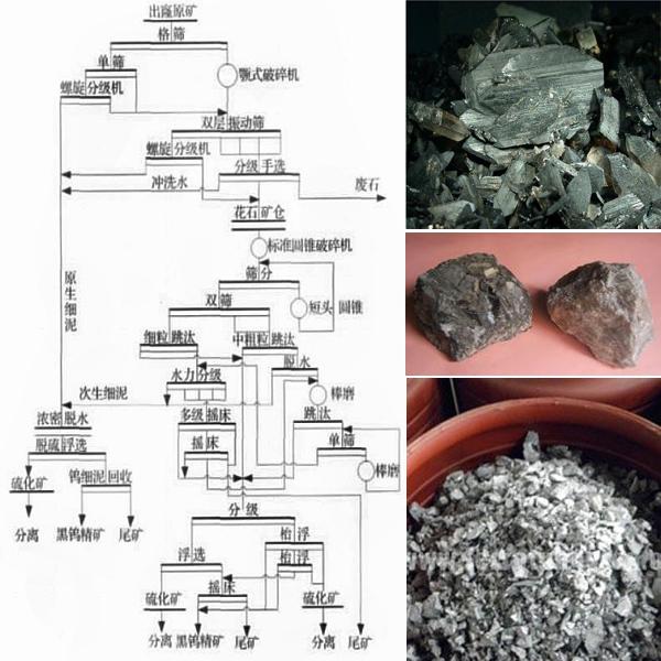 黑鎢礦多為石英大脈型或細(xì)脈型鎢礦床,嵌布粒度較粗,較易選別分離。對(duì)于黑鎢礦的選別,主要是以重選為主的聯(lián)合選礦工藝,分粗選、重選、精選和細(xì)泥處理4個(gè)階段。